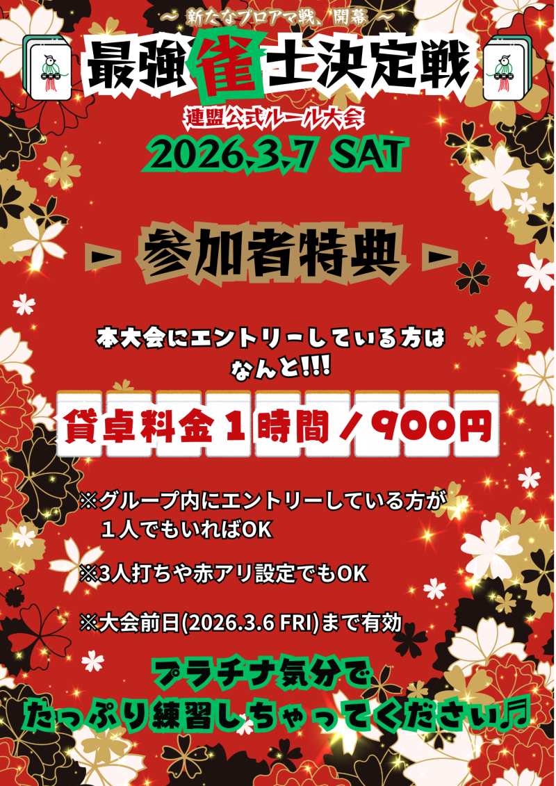 ノーレートさくらんぼリーグ開催中!毎週土曜日13:00~19:00三麻ノーレートフリー・毎週日曜日13:00~19:00四麻東南戦ノーレートMリーグルール※毎週日曜日は事前エントリー制❀参加ご予約受付中!