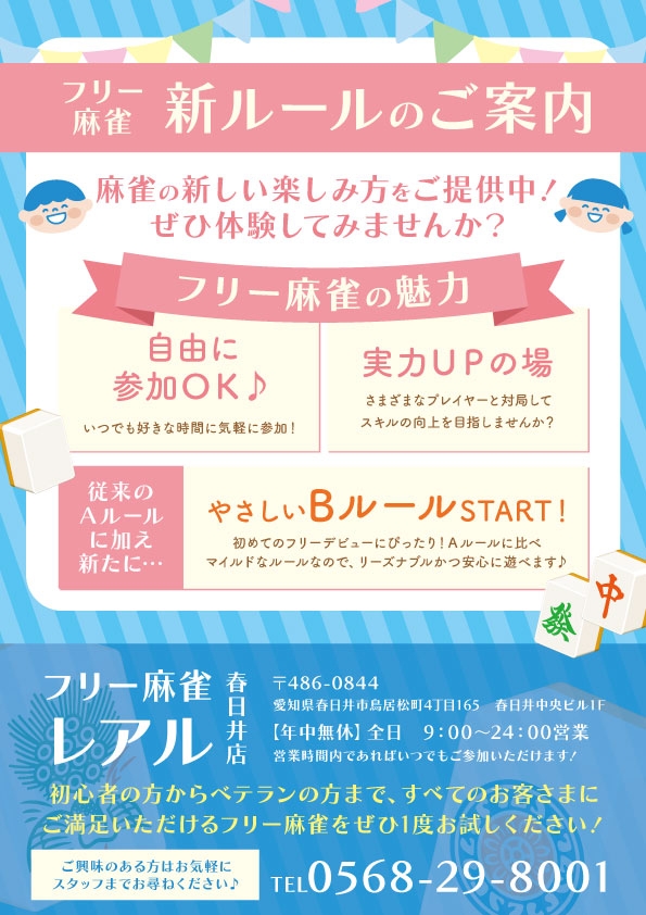 | フリー麻雀 レアル 春日井店フリーが初めての方、学生や女性の方でも楽しんでいただける新ルールを追加いたしました!