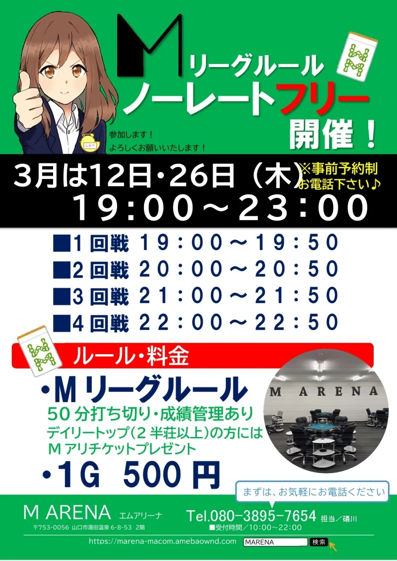 | M ARENA 山口で4人打ちするならココ!!2022年にオープン!!(広くてきれいな麻雀店)開催期間:2026年01月01日(木) ~ 2027年12月31日(金)
