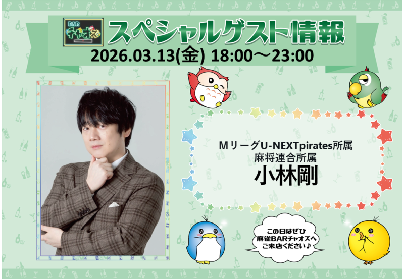 日本プロ麻雀協会・U-NEXTパイレーツ所属の仲林圭プロの来店が決定!