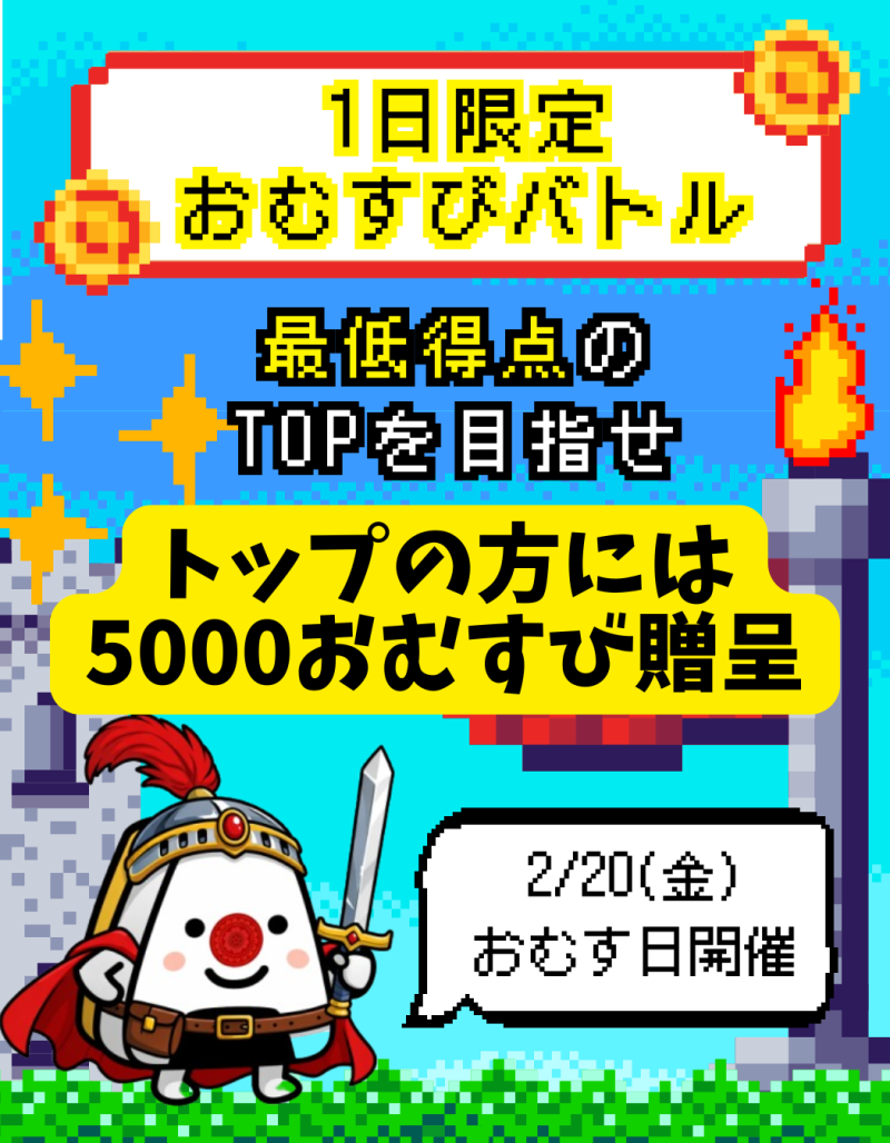 2/20(金)の1日で、最低得点でトップを獲った方に、5000おむすびを贈呈いたします(^▽^)/