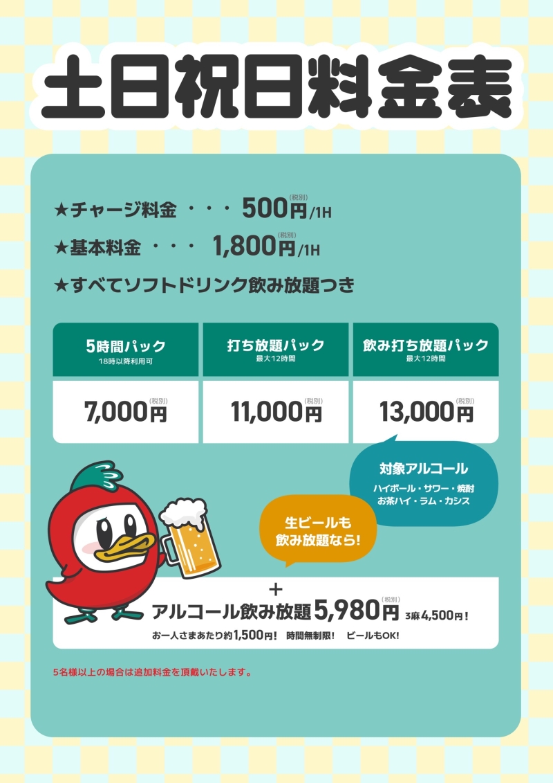1卓フリードリンク付き1ℍ/660円(税込み)