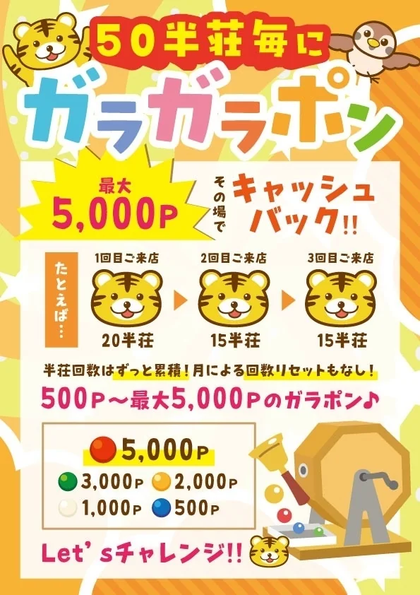 ご来店時より数えて10半荘達成時に1回、福引が引けます。