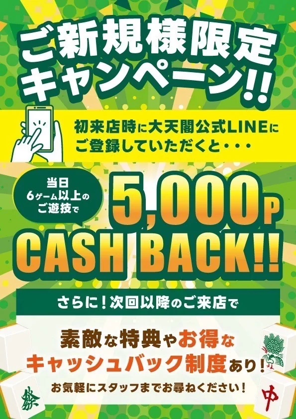 初めてご来店いただく際に、大天閣公式LINEにご登録いただき、6ゲーム以上の遊技をお楽しみいただくと、その日に限り5000ポイントをプレゼントいたします。