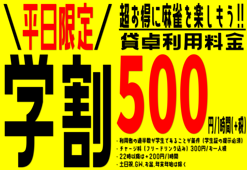 | リーチ麻雀 まさる京都店【平日限定学割】を開催いたします♪
