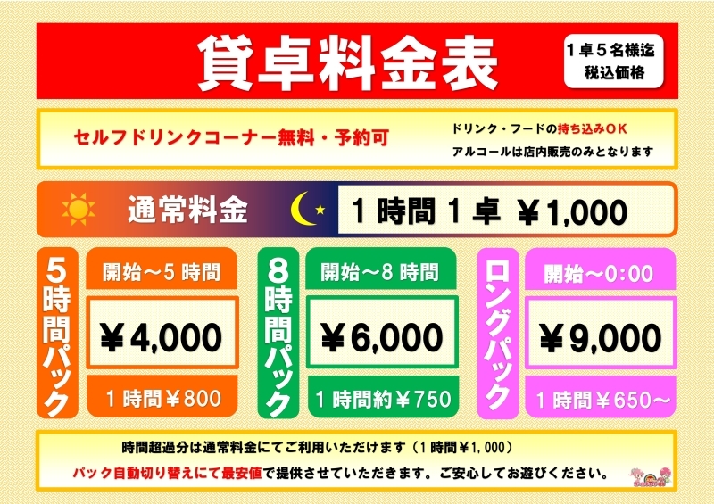 貸卓料金500円/1時間