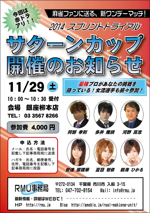 2014スプリントトライアル サターンカップ 最強プロがあなたの挑戦を待っている! 女流選手も続々参加! 日時 2014/11/29(日) 受付 10:00~10:30 参加費:4000円 会場:銀座柳本店 中央区銀座1-4-11 銀松ビル2F TEL 03-3567-8266 申込方法: 氏名・電話番号を記載しメールを(info@rmu.jp)送信してください メール環境の無い方は、上記をハガキに記載して下記まで郵送してください →〒272-0134 千葉県市川市入船3-15 RMU事務局 【詳細情報】 RMU http://www.rmu.jp/web/index.php RMU ブログ http://ameblo.jp/real-mahjong-unit/