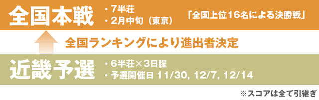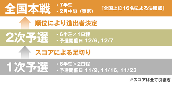 10/26,11/9,11/16,11/23のうち、2回(12半荘)の合計得点が1次予選の得点となります。