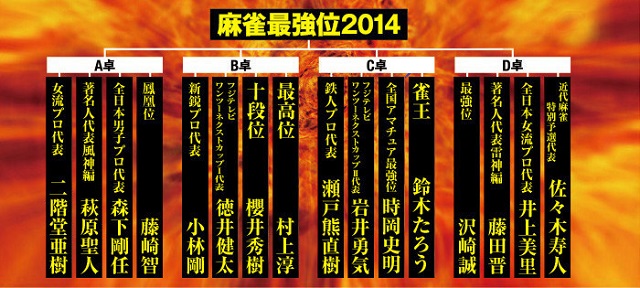 麻雀最強戦2014ファイナルは、全日本プロ代表の森下、新鋭プロ代表の小林、アマチュア最強位の時岡、著名人代表の藤田が決勝に進出。