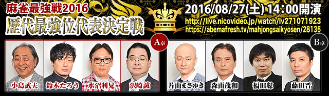 配信)麻雀最強戦2016 歴代最強位代表決定戦 8月27日 14:00 - 21:00 放送予定
