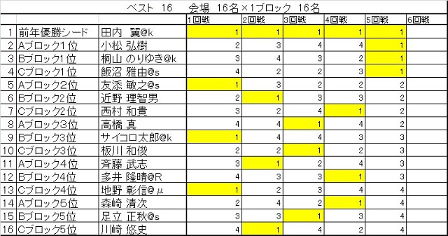 【ベスト16卓組】 ベスト16の卓組が決定いたしました。 1卓のみ配信予定をしており、黄色の方が配信卓となります。
