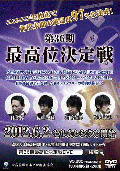 第36期最高位決定戦DVD 6月2日(土)セル&レンタルでリリース開始。 最終節4回戦の闘牌を完全収録!全8時間収録、2枚組で税込み5880円。 最高位戦HP(準備中)、アマゾンなどの各通販サイトで予約受付中! アマゾン販売ページはこちらから こちらの情報は最高位戦日本プロ麻雀協会のニュースページにも 掲載されております。 最高位戦ニュースページはこちらから