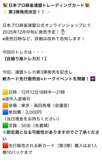 【日本プロ麻雀連盟】トレーディングカード第3弾発売決定!!2025年12月中旬に発売予定!