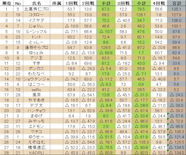 6~9位:準決勝Bを開催。4名で半荘2回戦を行い、上位1名が決勝進出。