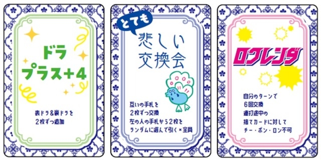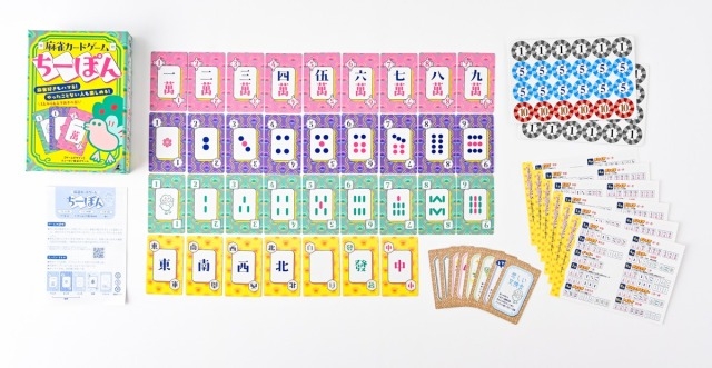 - 麻雀カード136枚+イベントカード8枚、チップ、役リスト6枚、説明書