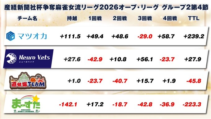 【麻雀】産経新聞社杯争奪 麻雀女流リーグ2026 オーブ・リーグ グループ2 第4節 道頓堀 / Neuro Vets / 関西まーすた / マツオカ【産経新聞社杯】