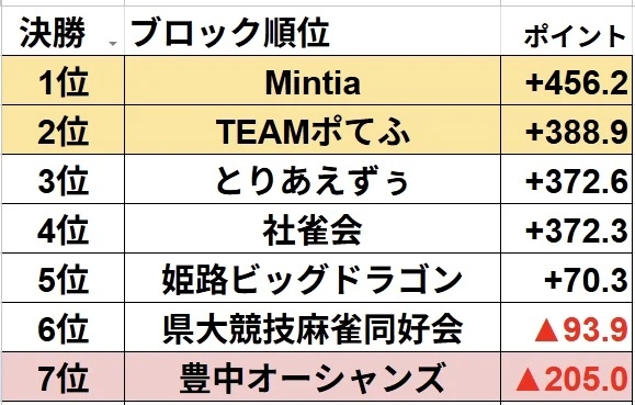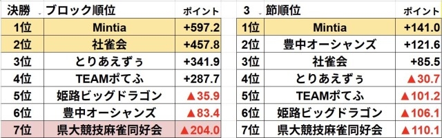 決勝進出チームは、第1位「Mintia」、第2位「社雀会」に決定!!