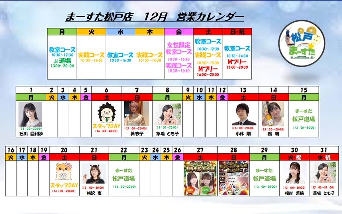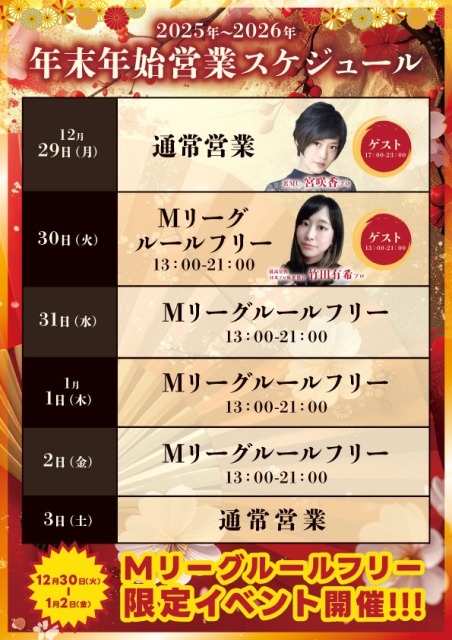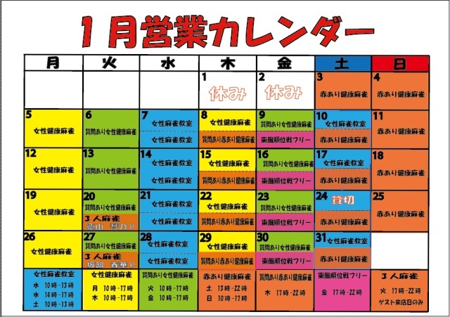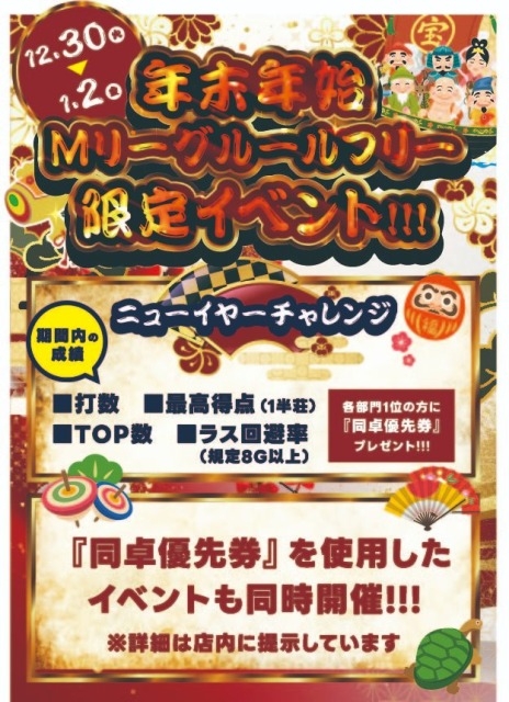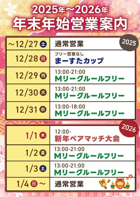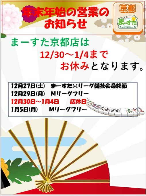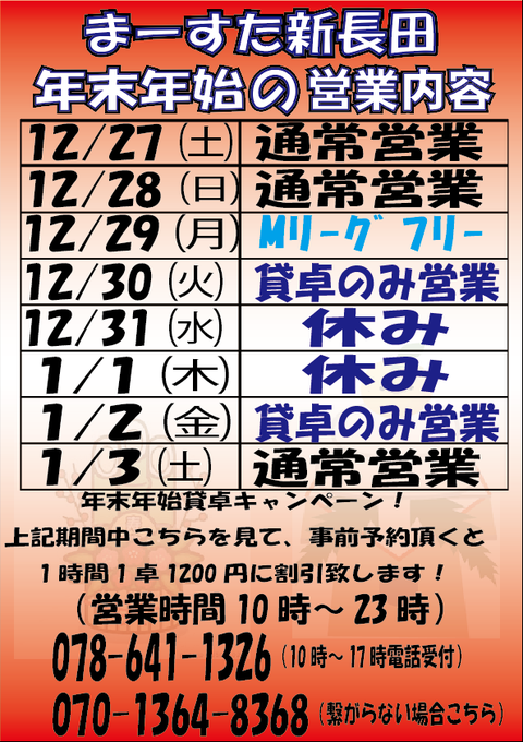 [禁煙健康マージャンまーすた]【年末年始スケジュール】