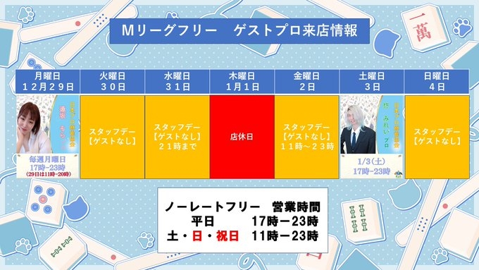 20日17時-22時 最高位戦日本プロ協会所属 徳山琴乃プロ 24日17時-22時 最高位戦日本プロ協会所属 坂部春華プロ