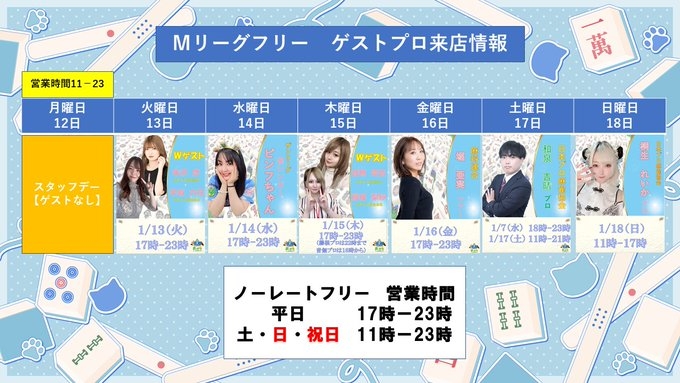 【Ⅿリーグフリー ゲストプロ来店情報】