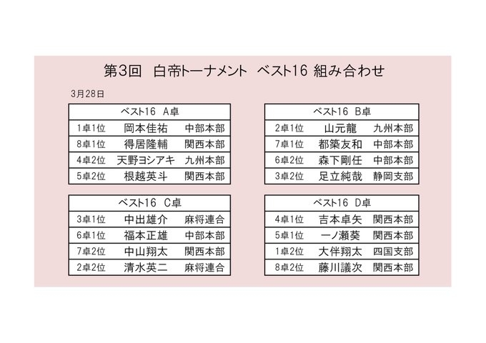 第3回白帝トーナメントベスト16組み合わせは以下の通りです。