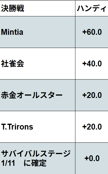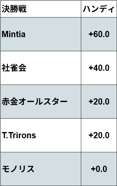 2/28決勝戦は「Mintia」「社雀会」「赤金オールスター」「T.Trirons」「モノリス」の5