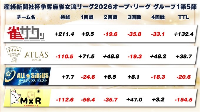 産経新聞社杯争奪麻雀女流リーグ2026オーブ・リーグ グループ1第5節 最終4回戦はATLASチーム木崎ゆう選手がトップで本日チーム3勝!雀サクッチームともトップラスを決め、その差100pt以内で最終節に突入致します。… pic.twitter.com/o8O2odb7MQ