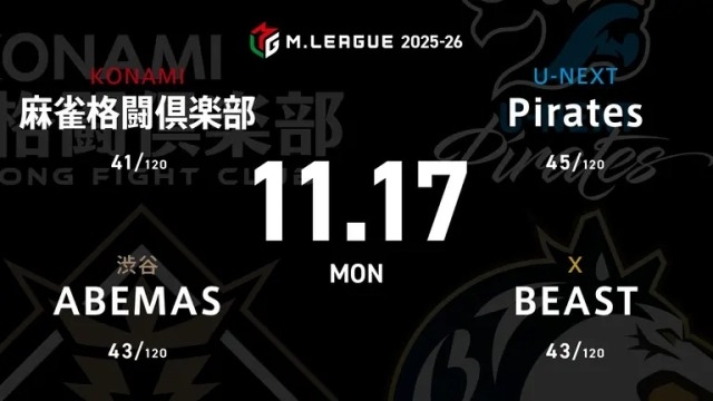KONAMI麻雀格闘倶楽部vs渋谷ABEMASvsBEAST XvsU-NEXT Pirates
