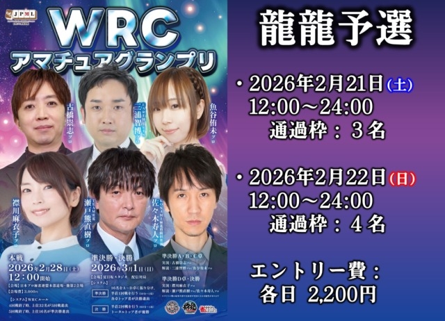 [日本プロ麻雀連盟公式オンライン麻雀サイト 龍龍] WRCアマチュアグランプリ 龍龍予選 (2026年度)