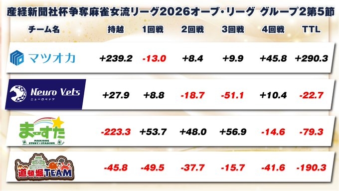 【麻雀】産経新聞社杯争奪 麻雀女流リーグ2026 オーブ・リーグ グループ2 第4節 道頓堀 / Neuro Vets / 関西まーすた / マツオカ【産経新聞社杯】