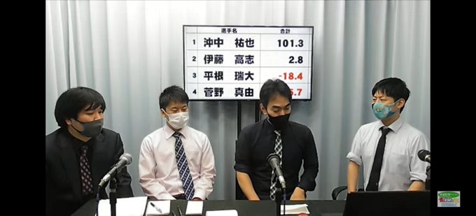 参加者3名と醍醐先生での対局後、牌譜データをもとにZoomでレッスンをおこないます。