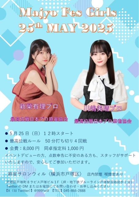 5月25日のまじょフェスGirlsは、最高位戦日本プロ麻雀協会新榮有理プロ&川嶋美晴プロがゲスト!