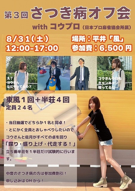 — 麻雀就活FESTA/8月24日(土)開催!イベントゲストは園田プロ (@FESTA_mahjong) July 22, 2024