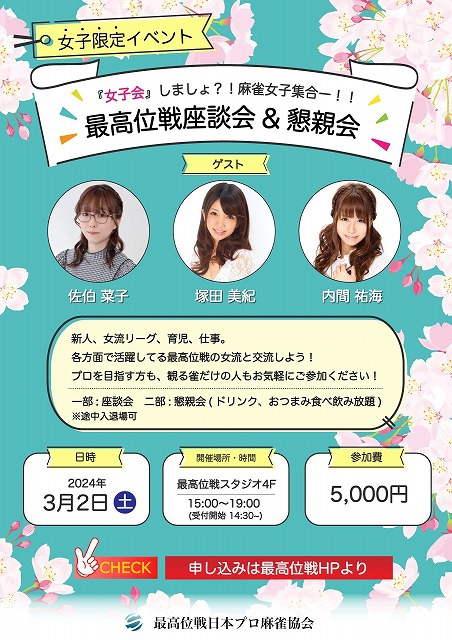 最高位戦日本プロ麻雀協会 女子限定イベント 最高位戦座談会&懇親会開催のお知らせ より