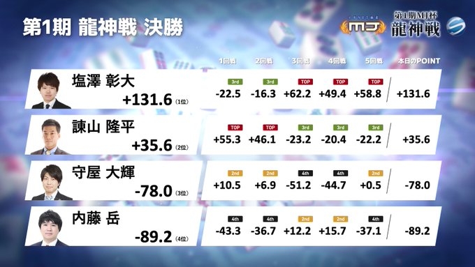 その後5回戦終了時の順位によって(ポイント持ち越し)半荘1回戦を行いトータル上位4名が決勝戦へ進出
