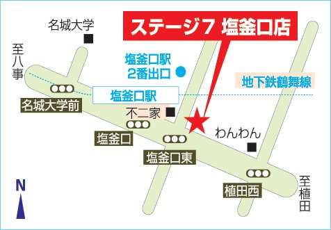 | お店までの道順 | 鶴舞線塩釜口駅2番出口から出て、見渡せばすぐに見つかります!!徒歩30秒以内です!! |