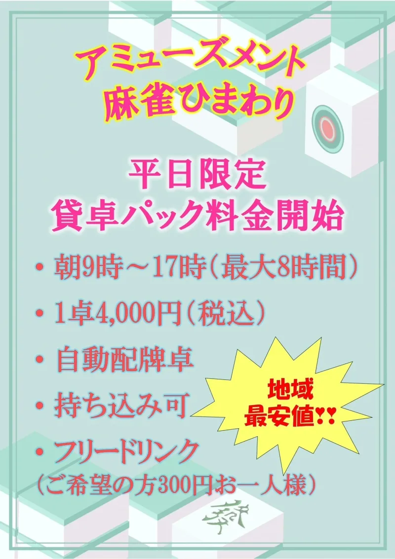 ご友人同士のお集まりや長時間の麻雀にぜひご利用ください♪