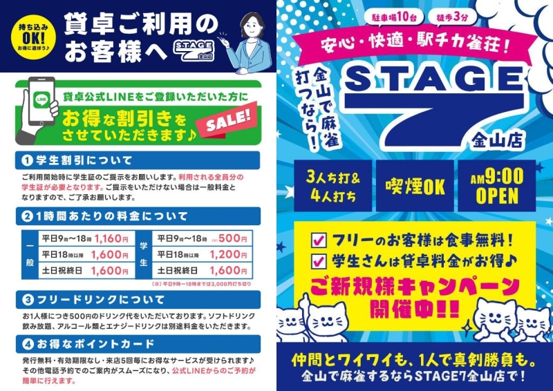 お店のPR | 駅チカ3分・駐車場10台!フリーは食事無料でお得に麻雀。 3人打ちも4人打ちもOK!テンパイ連荘採用・学生さんは貸卓料金がお得♪ 毎朝9時OPEN!喫煙OK&ご新規キャンペーン開催中! 金山で打つならステージセブン!安心・快適・駅チカ雀荘 仲間とワイワイも |