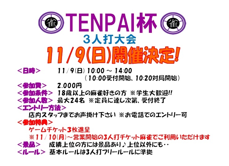 R7, 11/9(日) TENPAI杯 3人打大会開催決定!!