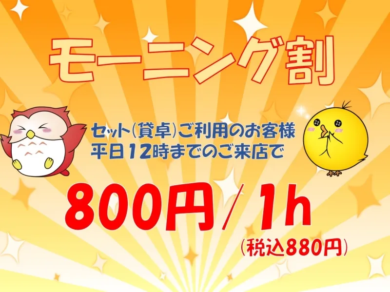 平日12時までにご来店のお客様限定で、セット価格がなんと800円/1h(税込880円)!