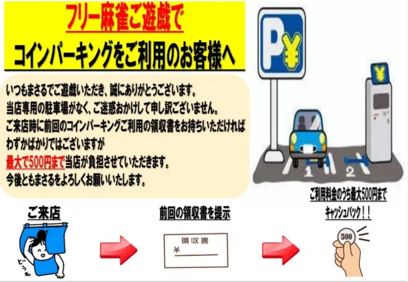 ご来店時に前回のコインパーキングご利用の領収書をお持ちいただければ、