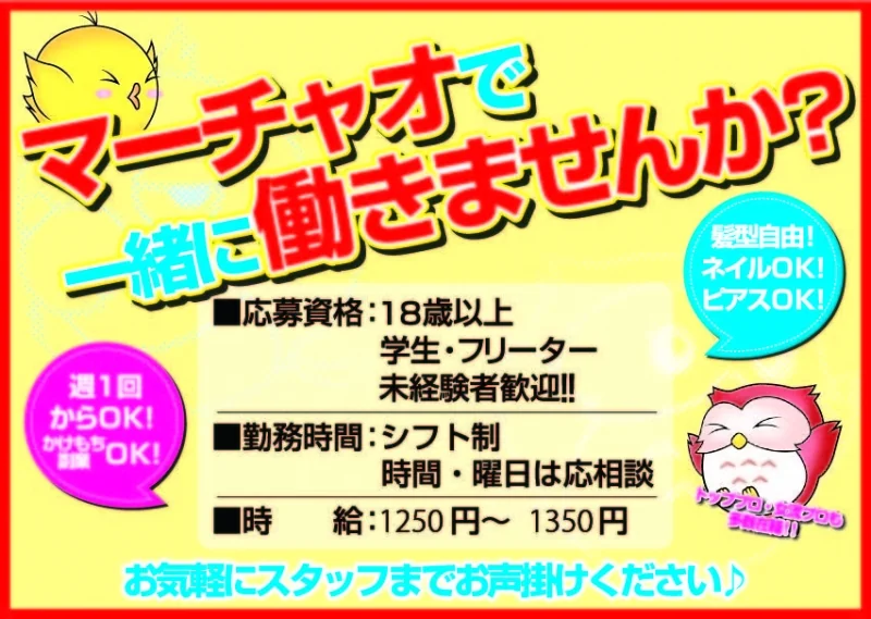 | 備考 | ・入社ボーナスキャンペーン! 採用されて必須条件を満たせば5000円支給します☆ ・スタッフ紹介キャンペーン! スタッフを紹介していただけたら20000円相当のゲーム券をプレゼント! いずれも期間限定となっております。 詳細はお電話にて☆ |