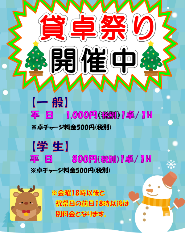 | 料金 (セット) | ☆お正月料金(12/19~1/5・10時) 一 般 1,760円(税込) 学 生 1,320円(税込) ※卓チャージ料金:550円(税込) ☆通常料金 (一 般) 平 日 1,100円(税込) / 1時間(1卓) 金曜18時~ 1,540円(税込) / 1時間(1卓) 祝祭日前日18時~ 1,540円(税込) / 1時間(1卓) ※卓チャージ料金:550円(税込) (学 生) 平 日 880円(税込) / 1時間(1卓) 金曜18時~ 1,100円(税込) / 1時間(1卓) 祝祭日前日18時~ 1,100円(税込) / 1時間(1卓) ※卓チャージ料金:550円(税込) |
