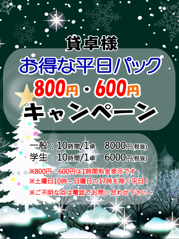 | 料金 (セット) | ☆お得な平日パック 800円・600円キャンペーン☆ 一般P 8,000円 10時間パック(税込8,800円) 学生P 6,000円 10時間パック(税込6,600円) ※上記は1卓/10時間料金になります。 ※土曜日10時~日曜日17時を除く平日! ※10時間以後は1卓/1時間「一般800円・学生600円」 (税抜)となります。 ※ご不明な点は電話でお問い合わせ下さい。 ※アルコール類の持ち込みはご遠慮ください。 ☆通常セット料金☆ 一 般 1,400円(税込1,540円) 1卓 / 1時間 5時間パック 5,000円(税込5,500円) 1卓 / 1時間 ※5時間パックは17時からご利用になれます。 ※5時間を過ぎても1,000円(税込1,100円) 1卓 / 1時間 でご利用できます。 ※アルコール類の持ち込みはご遠慮ください。 |