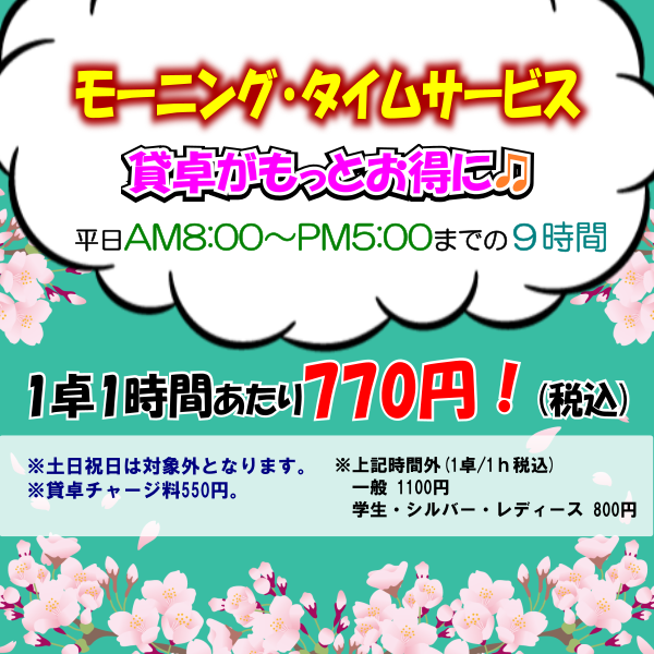 | 料金 (セット) | ☆「モーニングタイム・サービス」 平日AM8時~PM5時まで(9時間) 1卓1時間770円(税込) 上記以外の時間は 一 般 1,100円(税込) / 1時間(1卓) 学 割 880円(税込) / 1時間(1卓)※学生証2名提示 シルバー割 880円(税込) / 1時間(1卓)※65歳以上2名 レディース割 880円(税込) / 1時間(1卓)※女性2名以上 ※チャージ:1卓 550円 |