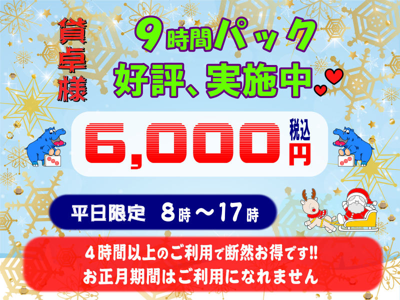 | 料金 (セット) | ☆お正月料金(12/27~1/5) 1,760円(税込) / 1時間(1卓) ※ソフトドリンク・一日チャージ料金440円(税込) を頂戴しています。 ☆「9時間パック」やってるよ~! 平日限定8時~17時の間 6,000円(税込) / 1時間(1卓) ※お正月期間(12/26~1/4)はご利用になれません。 ※ソフトドリンク・一日チャージ料金440円(税込) を頂戴しています。 ☆通常料金 [一 般] 平 日 1,320円(税込) / 1時間(1卓) 土日祝日 1,760円(税込) / 1時間(1卓) [学 生] 平 日 1,100円(税込) / 1時間(1卓) ※ソフトドリンク・一日チャージ料金440円(税込) を頂戴しています。 |