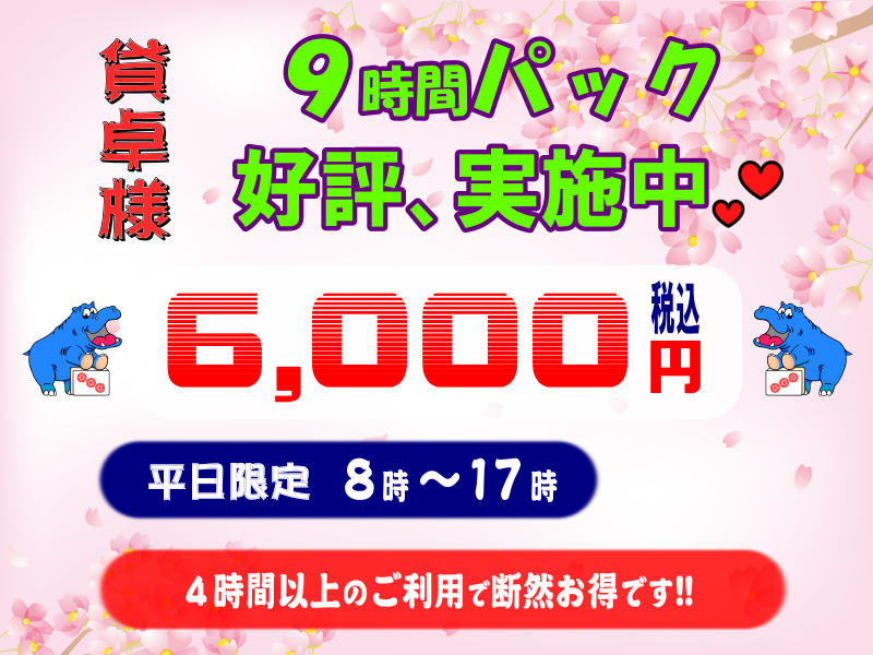 | 料金 (セット) | ☆「9時間パック」やってるよ~! 平日限定8時~17時の間 6,000円(税込) / 1時間(1卓) ※ソフトドリンク・一日チャージ料金440円(税込) を頂戴しています。 ☆通常料金 [一 般] 平 日 1,320円(税込) / 1時間(1卓) 土日祝日 1,760円(税込) / 1時間(1卓) [学 生] 平 日 1,100円(税込) / 1時間(1卓) ※ソフトドリンク・一日チャージ料金440円(税込) を頂戴しています。 |