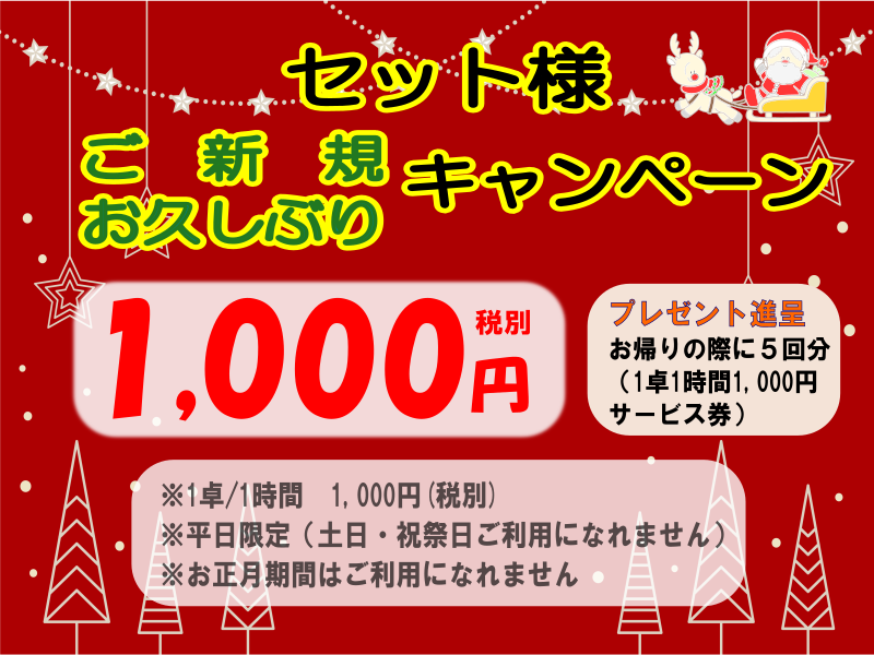 | 料金 (セット) | ★お正月料金(12/26~1/4) 会 員 1,600円 (税込1卓 / 1時間) 非会員 2,000円 (税込1卓 / 1時間) ※期間中は学割・レディース割はありません。 ※キャンペーン、サービス券、クーポンはご利用になれません。 ★新規セット様キャンペーン 一般 1,100円(税込) 1卓 / 1時間 ※平日限定 ※土日・祝祭日・正月・お盆・GWはご利用になれません ※ご不明な点はご連絡ください。 ★通常営業 一 般 1,320円(税込) / 1時間(1卓) 女性割 1,210円(税込) / 1時間(1卓・1~2人) 女性割 990円(税込) / 1時間(1卓・3~4人) 学 割 660円(税込) / 1時間(1卓・3人以上) ※毎週水曜日はレディースDAY 13時~17時無料 条件:1卓/女性4名以上 卓数に制限がございます ※土日祝祭日・お盆・正月・GWを除く |