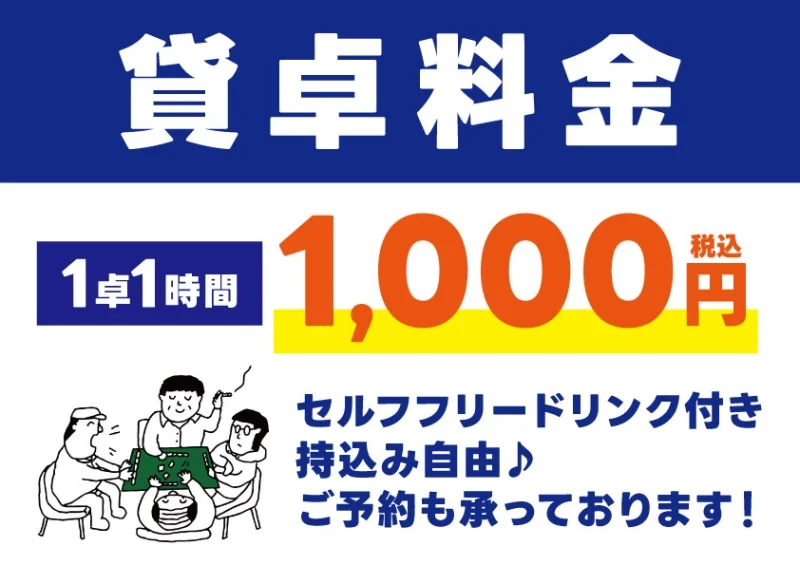 | 料金 (セット) | 【一般】1卓1時間 1,000円税込 ※おひとり様入店料200円が別途必要です。 セルフドリンク付き 飲食持ち込み自由、大歓迎。 |