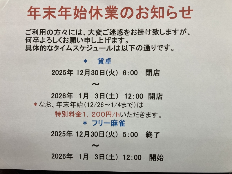 貸卓・フリー麻雀とも翌8/21(木)午前まで。
